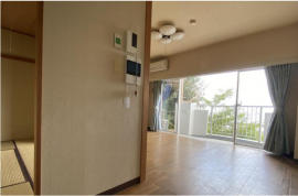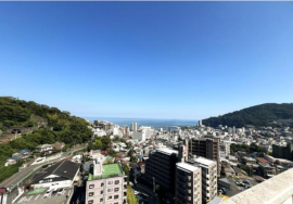 ブルーシー熱海 相模湾を一望する高層階の美室 6階建5階部分2K リフォーム歴あり JR「熱海」駅よりバス11分、「錦ヶ浦」停徒歩14分、またはJR「熱海」駅より車約10分。相模湾を一望する高台に建つリゾートマンション 温泉大浴場・屋上プール・アスレチックルーム付き 駐車場1台無料